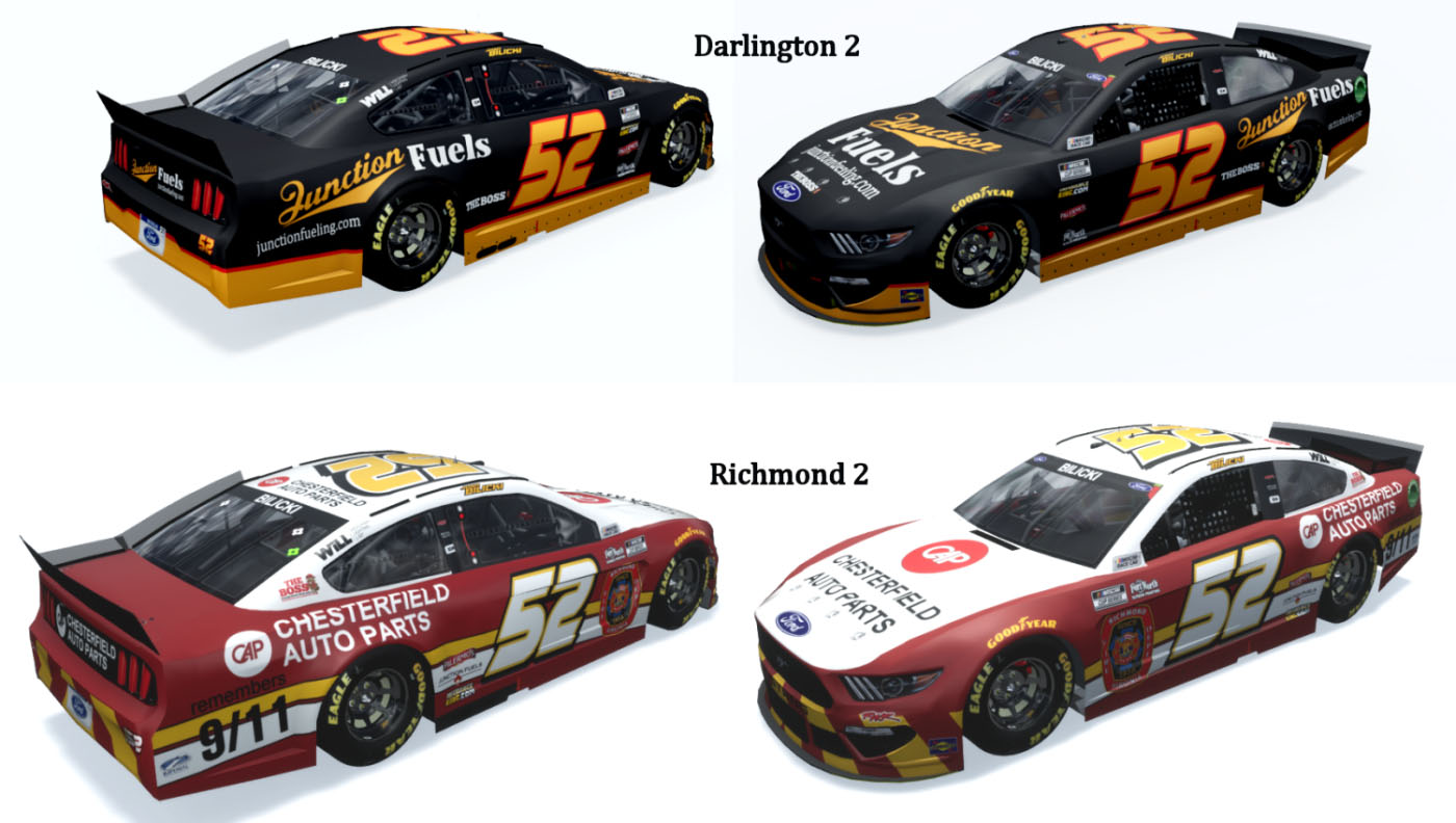 2021 #52 Josh Bilicki from Darlington 2 and Richmond 2. MENCS 2019 mod & template - Splash n' Go with Lefty template update...... #'s - me...... B-pillar decals - Rick's 2021 B-Pillars/me...... Sponsor logos from various internet sites/me...... Pit crew - SteveZ ( modified )...... NRatings for driver rating...... Render - carviewer from Burnout3D......
